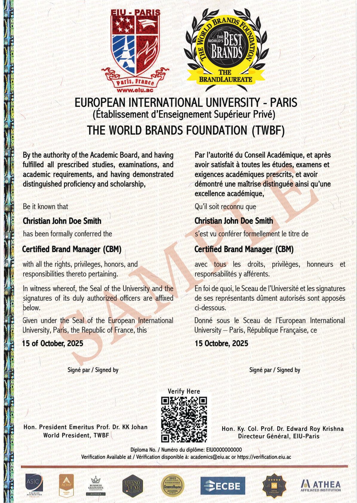 The Certified Brand Manager (CBM) represents the intermediate level of the International Professional Certification in Brand Strategy and Leadership (IPC-BSL) jointly developed by The World Brands Foundation (TWBF) and European International University (EIU–Paris).