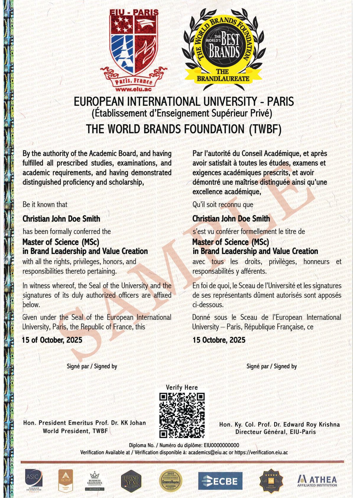 The MSc in Brand Leadership and Value Creation (BLVC) develops high-level capability in strategic brand leadership, innovation, stakeholder value, and measurable brand performance. The degree integrates the complete Certified Brand Manager (CBM) and Certified Brand Strategist (CBS) curricula and culminates in an Advanced Brand Leadership Capstone. It is mapped to EQF/QCF Level 7 with a total of 150 ECTS.